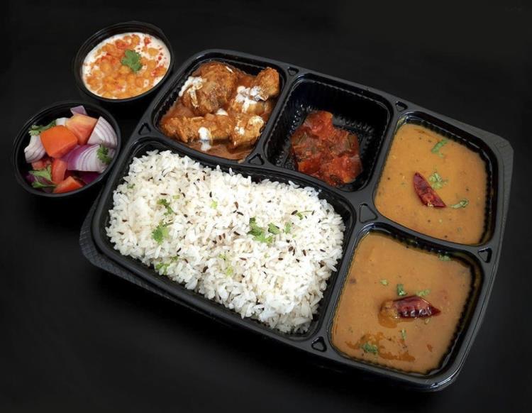 Bento box with Paneer Butter Masala, choice of Sabz Kadai OR Sabz Jalfrezi, Yell...