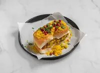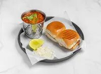 Bento box with 1 pc Pav Bhaji, 1 pc Dahi Wala Mirch, 1 pc Mini Samosa, 1 pc Moti...