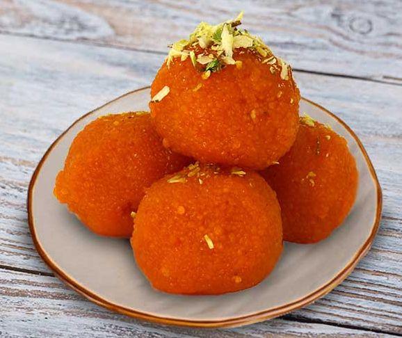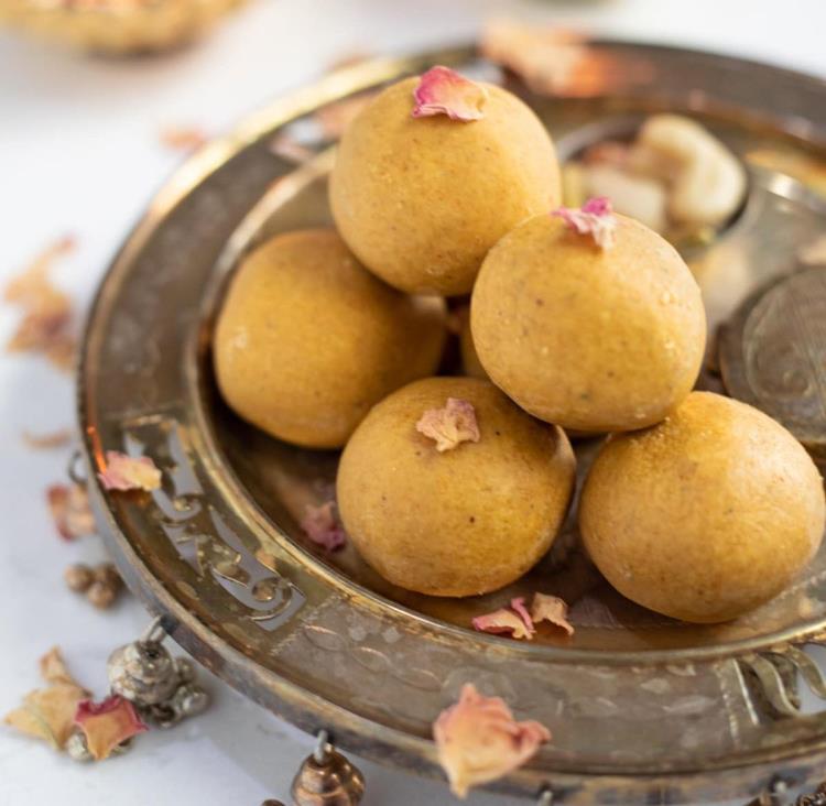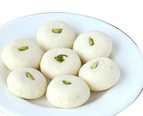 Golden fried milk solid balls dipped in rose flavoured sugar syrup